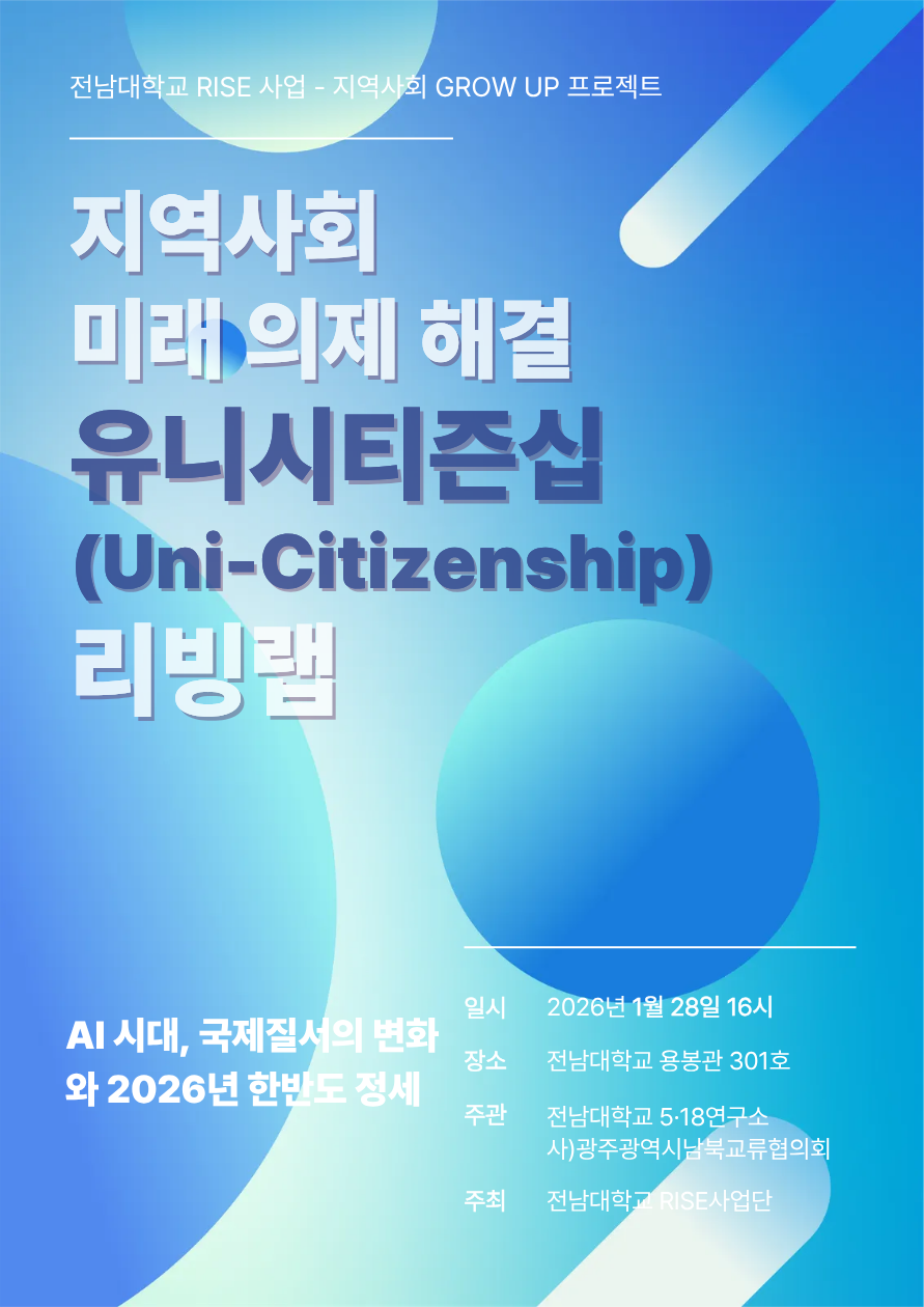 전남대5·18연구소는 광주광역시 지역혁신중심 대학지원체계(RISE) 사업의 일환으로, “AI 시대’, 국제질서의 변화와 2026년 한반도 정세” 주제의 토론회를 진행합니다. 또한 학술연구를 기반으로 지역사회 갈등 이슈를 공론장으로 확장하고, 광주형 지역 아카이브 구축과 같은 미래 의제를 도출하기 위한 다양한 논의를 진행할 예정입니다.